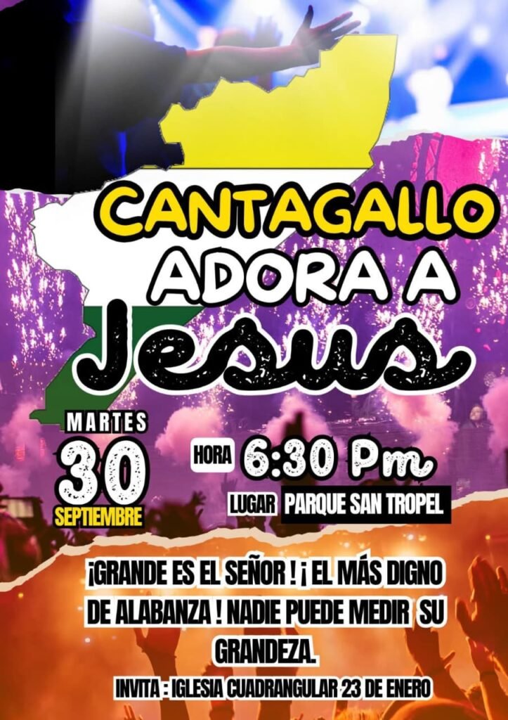 Este martes 30 de septiembre, a partir de las 6:30 de la tarde, el municipio de Cantagallo vivirá un espacio de fe, música y encuentro espiritual con el evento “Cantagallo adora a Jesús”.