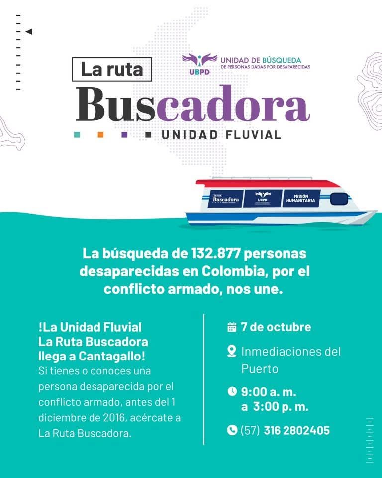 La Ruta Buscadora Fluvial de la Unidad de Búsqueda de Personas Dadas por Desaparecidas (UBPD) arribará este 7 de octubre al municipio de Cantagallo, en el sur de Bolívar, con el propósito de encontrarse con las familias que continúan buscando a sus seres queridos desaparecidos durante el conflicto armado.
